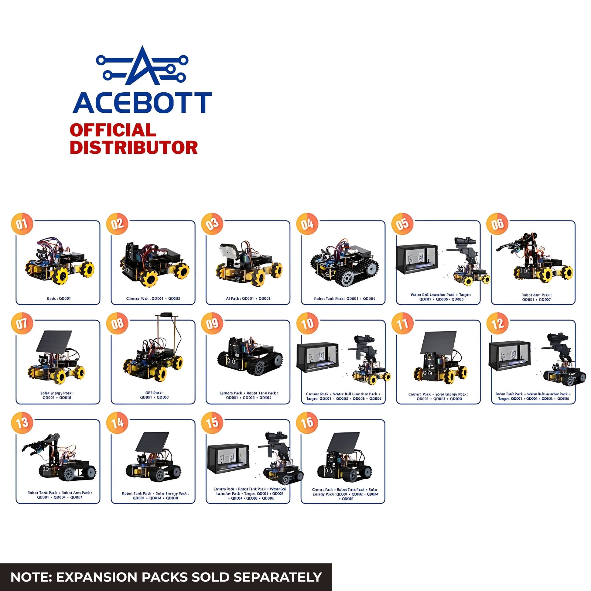 Expandable & Customizable: Supports numerous expansion packs, including a Camera Pack (QD002), Al Pack (QD003), Robot Tank Pack (QD004), Water Ball Launcher Pack (QD005), Target (QD006), Robot Arm Pack (QD007), Solar Energy Pack (QD008), GPS Pack (QD009), and others for endless learning possibilities. (Note: Expansion packs sold separately)