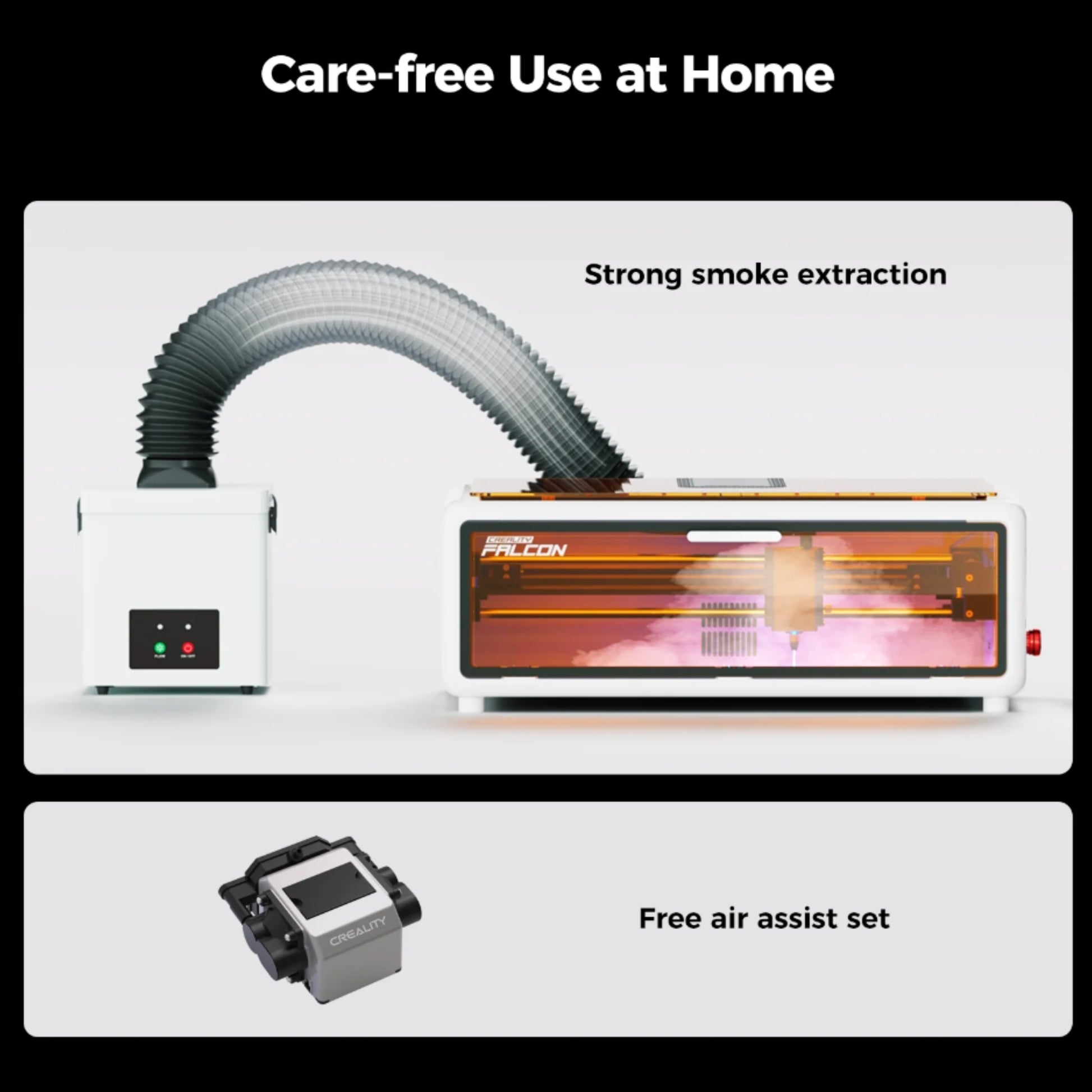 - Air Assist System: Enhances cutting performance and reduces charring on materials.